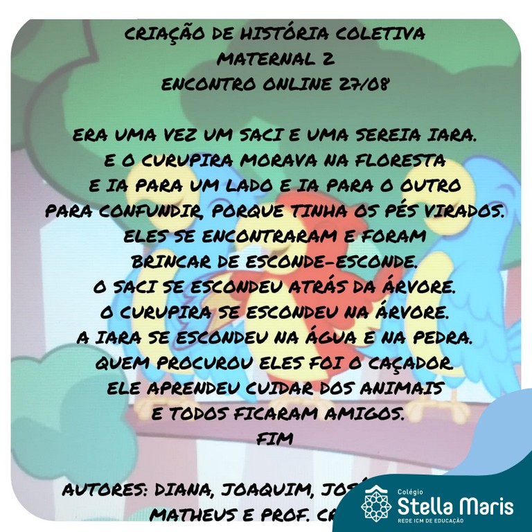Era uma vez um Saci e uma sereia Iara. E o Curupira morava na floresta e ia para um lado e ia para o outro para confundir, porque tinha os pés virados. Eles se encontraram e foram brincar de esconde-esconde. O Saci se escondeu atrás da árvore. O Curupira se escondeu na árvore. A Iara se escondeu na água e na pedra. Quem procurou eles foi o caçador ele aprendeu a cuidar dos animais e todos focaram amigos. FIM.