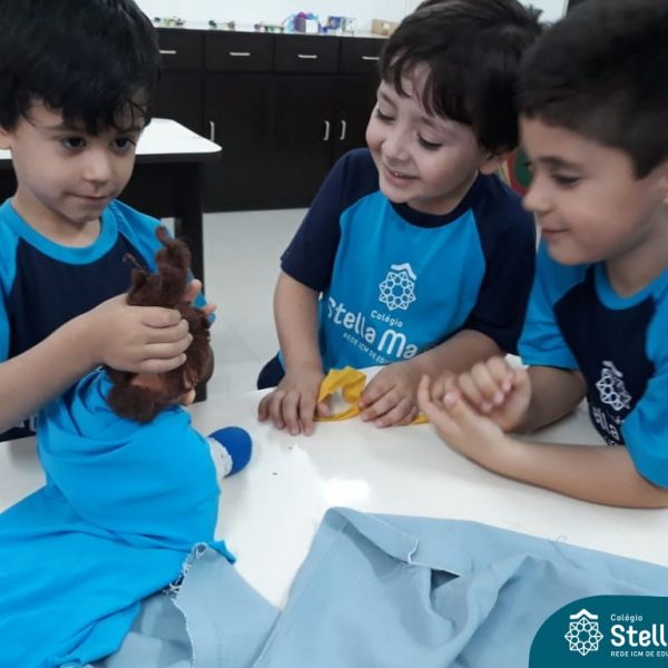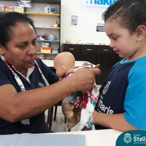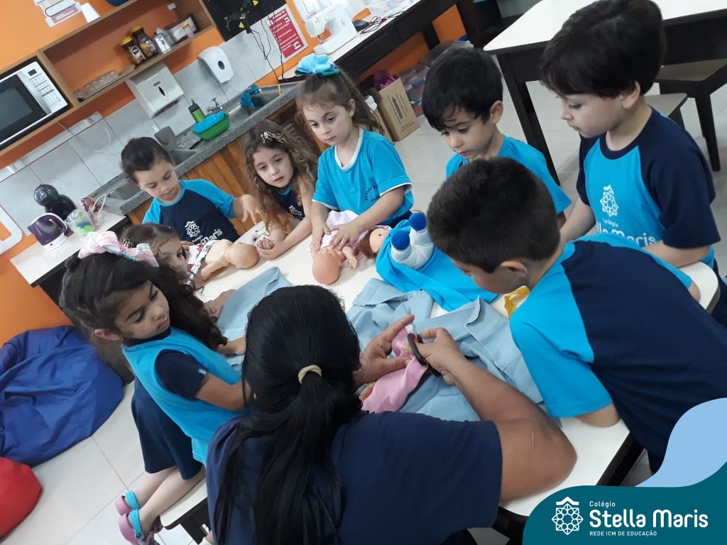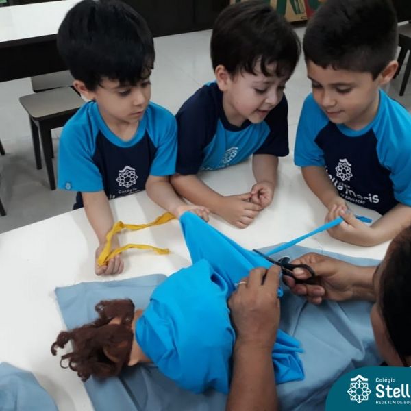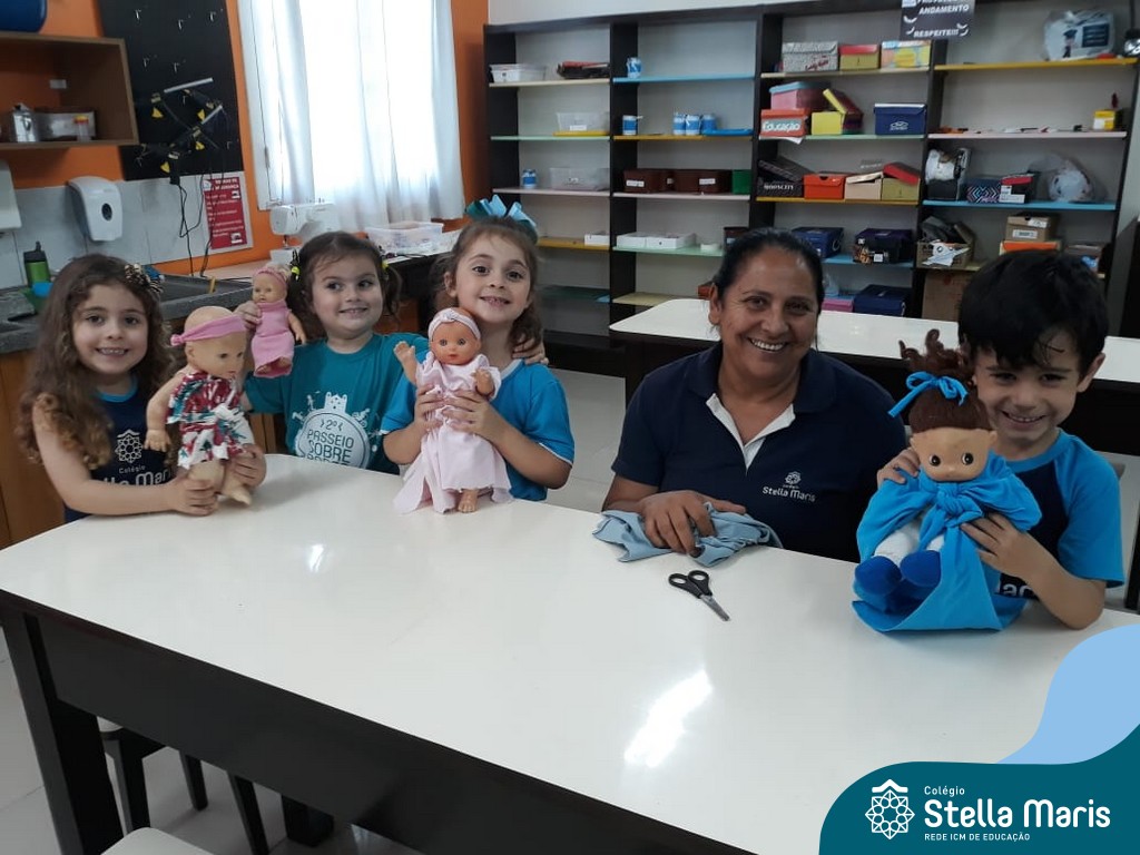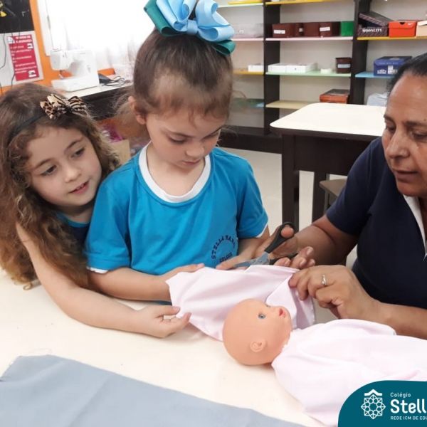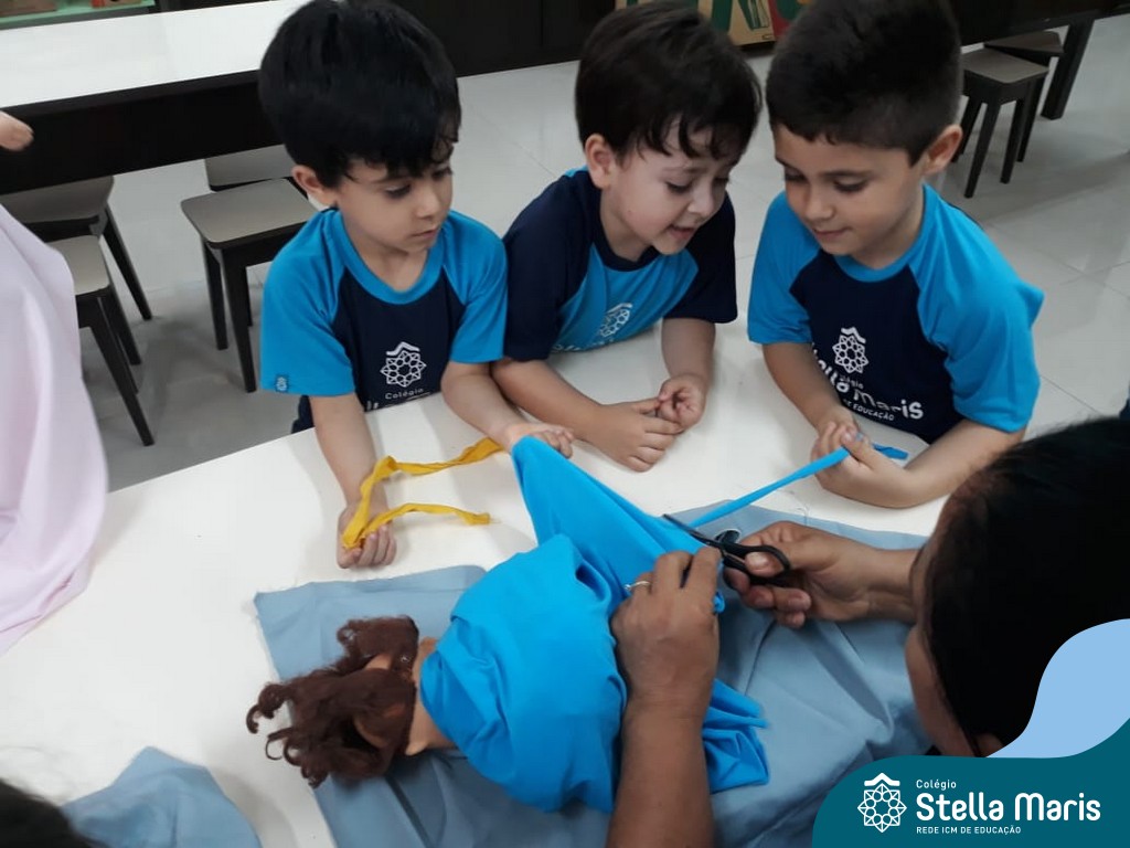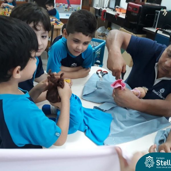 Nossos pequenos do Maternal 2 adoram participar das atividades na Sala Maker. Desta vez, junto com a construção com jogos e a pipoca no microondas, que eles adoram, também confeccionaram roupinhas para bonecas, com a ajuda da auxiliar Lélis! Que momentos únicos!