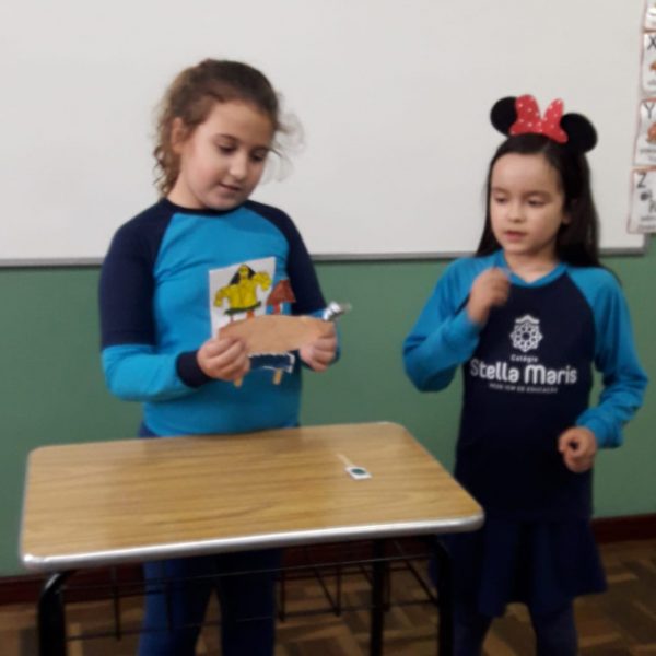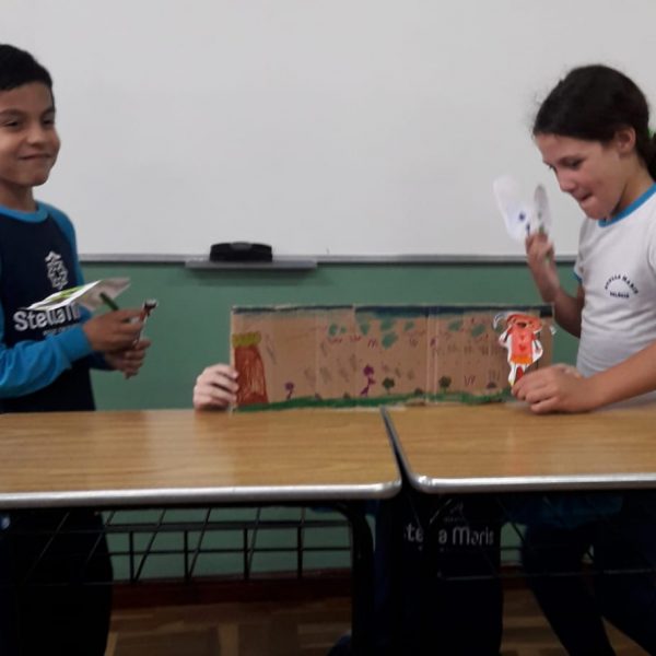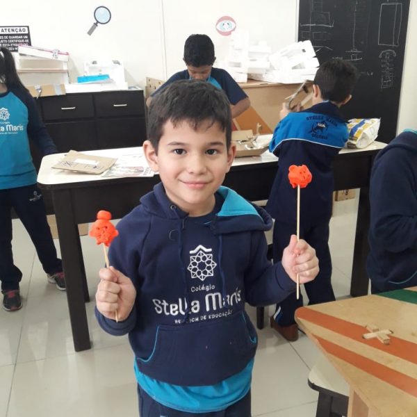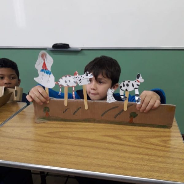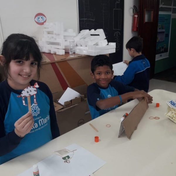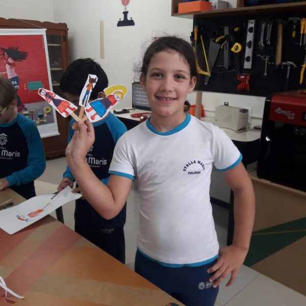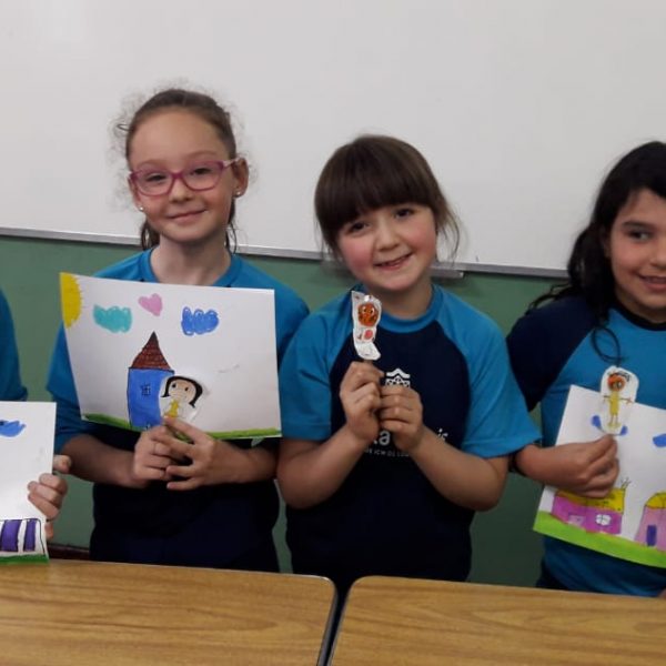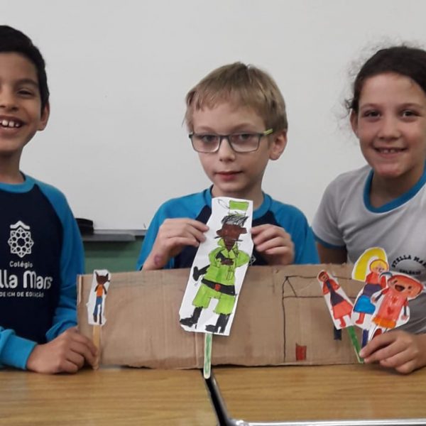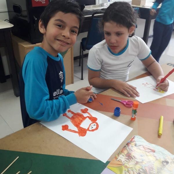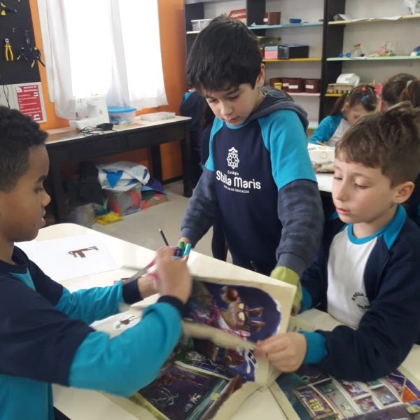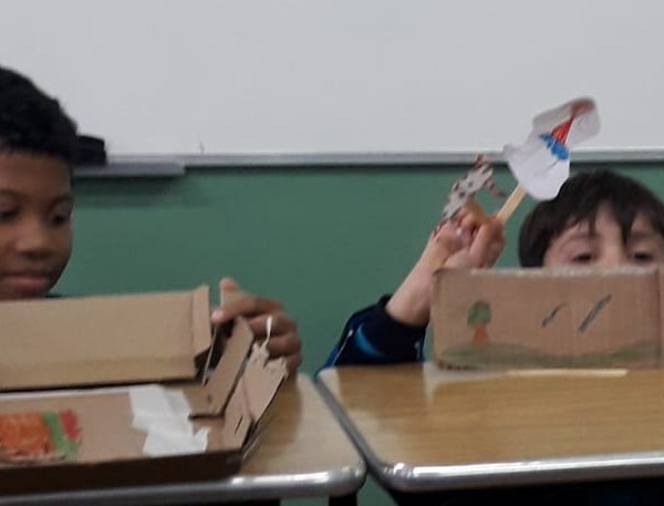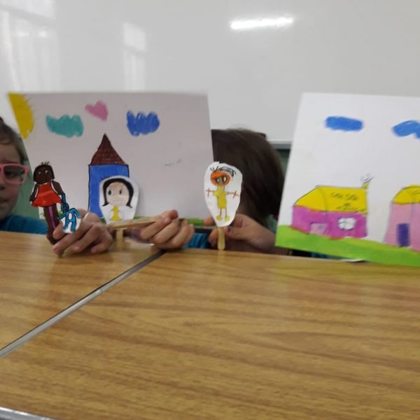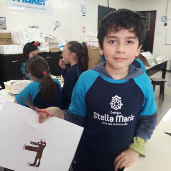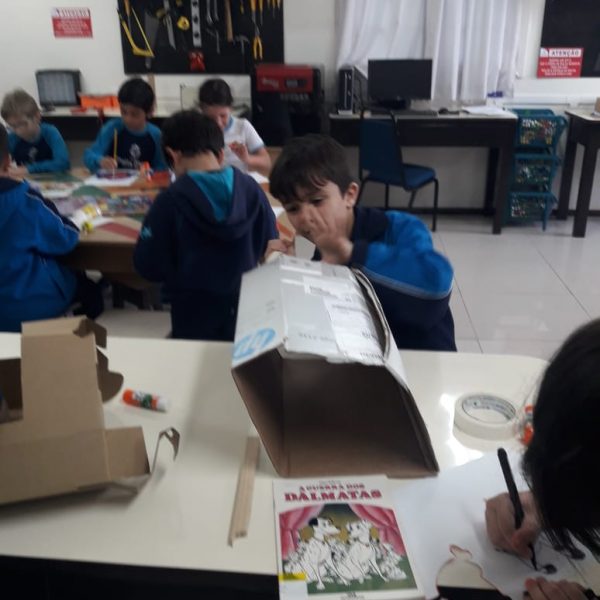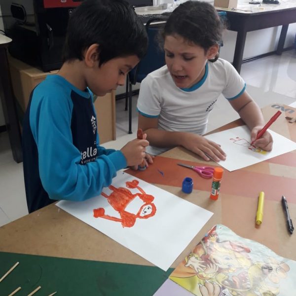 Na sala maker, os alunos da turma 23, juntamente com a professora Rita, construíram personagens e cenários de livros de histórias retirados da biblioteca dias antes. Depois, em sala de aula, os grupos apresentaram as histórias modificadas e recriadas que haviam construído na sala maker. Foi uma experiência riquíssima para toda a turma!