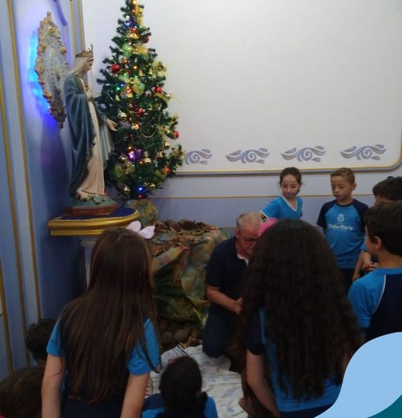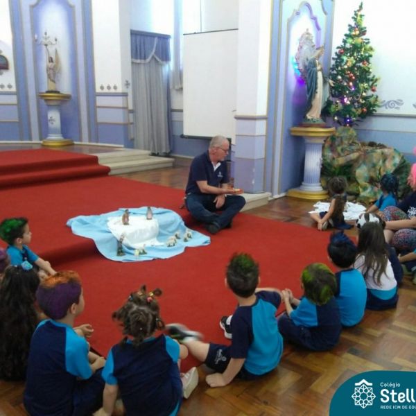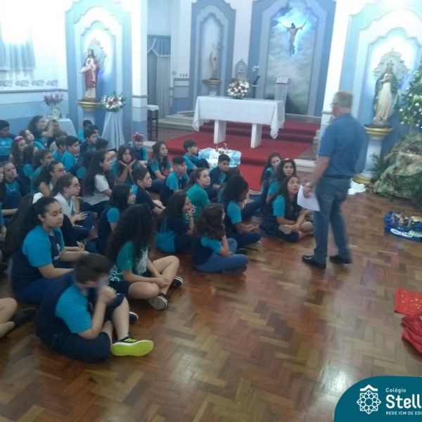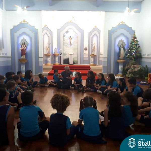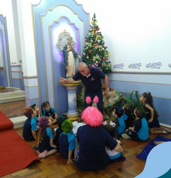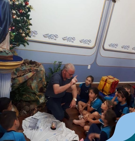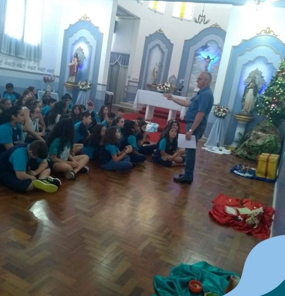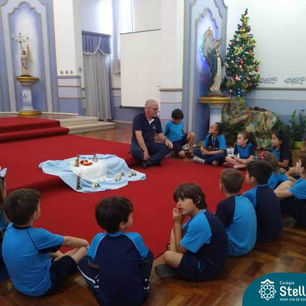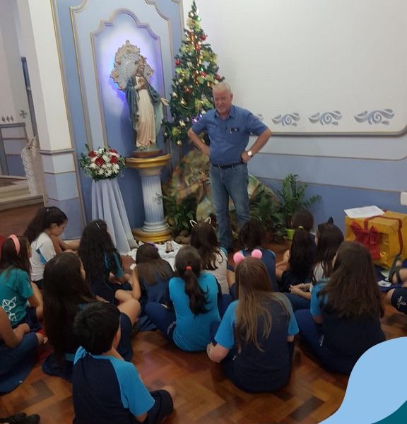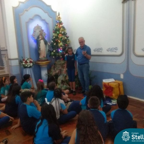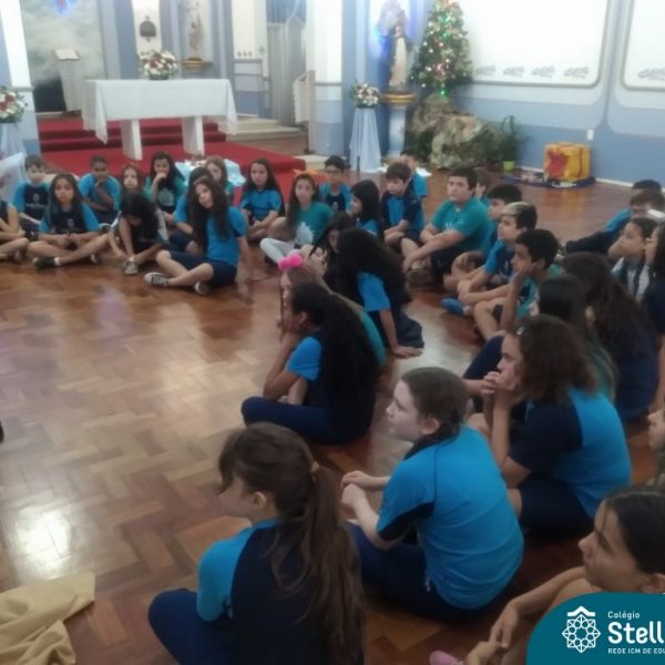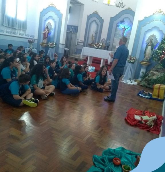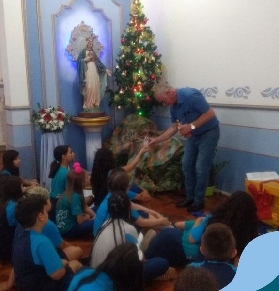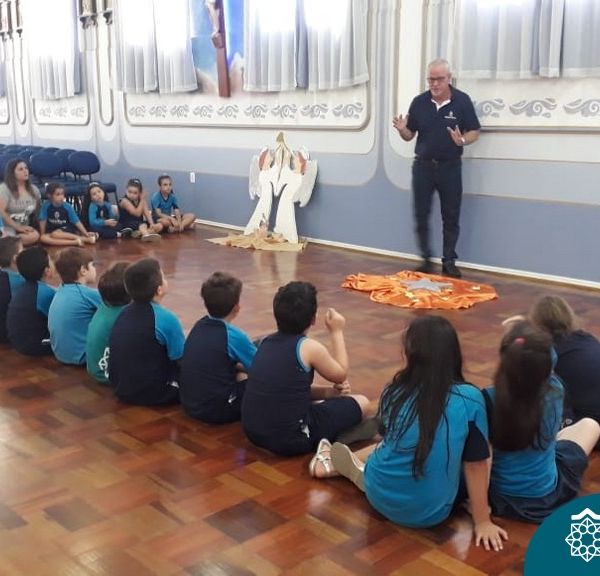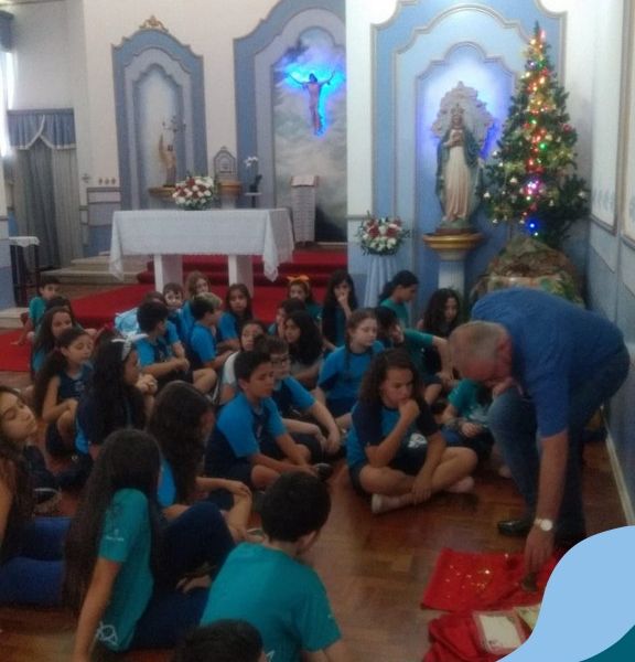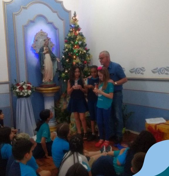 No Momento Pastoral do mês de dezembro os alunos da Educ. Infantil ao 5º ano, realizaram uma Formação sobre os verdadeiro significado dos Símbolos Natalinos, na Capela, juntamente com o Padre Edison e as professoras. Durante a reflexão os alunos foram conhecendo cada símbolos e interagindo, motivados pelo Padre. Receberam a benção no final do encontro, momento emocionante de oração e cultivo da fé.