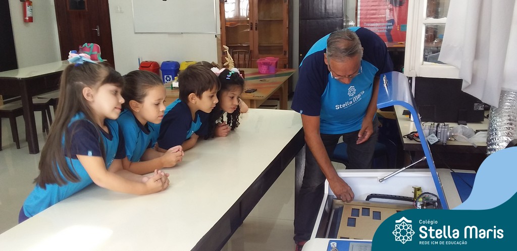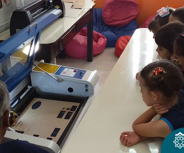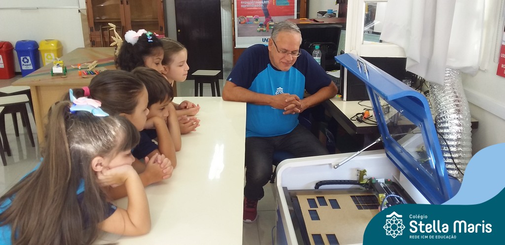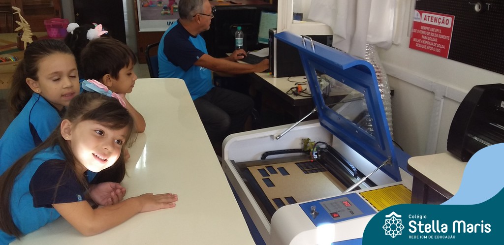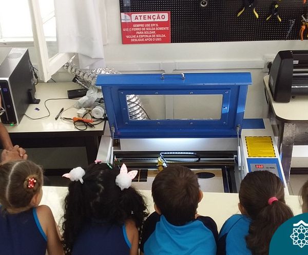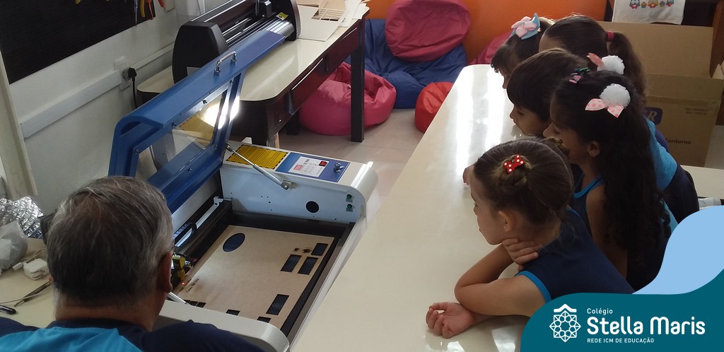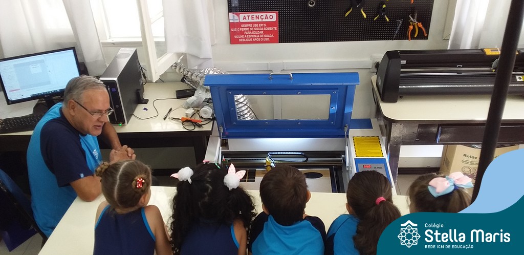 A turma do Pré 1/2 A da prof Dani, da manhã, visitou a Sala Maker. Sob a supervisão do professor André, as crianças conheceram uma máquina cortadora a laser e tiveram a oportunidade de vê-la funcionando e fazer várias perguntas ao professor. Foi um momento mágico e inesquecível!!!