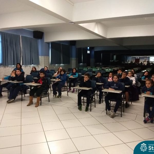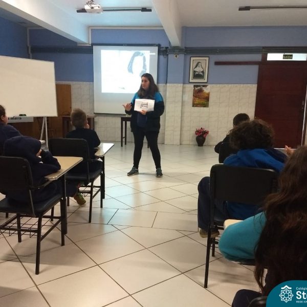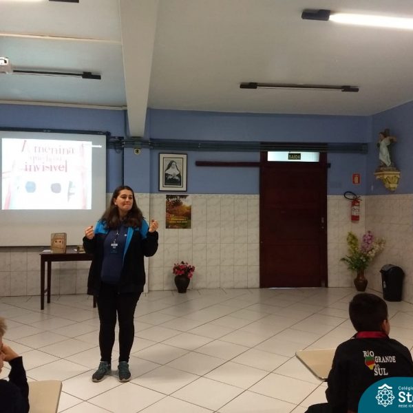 A Rita prontamente aceitou o convite, e nos presenteou com a história da Anne Frank, escrita para crianças, numa linguagem mais leve. A contação aconteceu no Salão Azul. Durante este momento, a história era projetada na lousa (digitalizada do livro “A menina que ficou invisível”, de Valéria Portella), com algumas imagens reais, abordando a questão do preconceito, da segregação, da guerra, fotos dos personagens reais, etc.