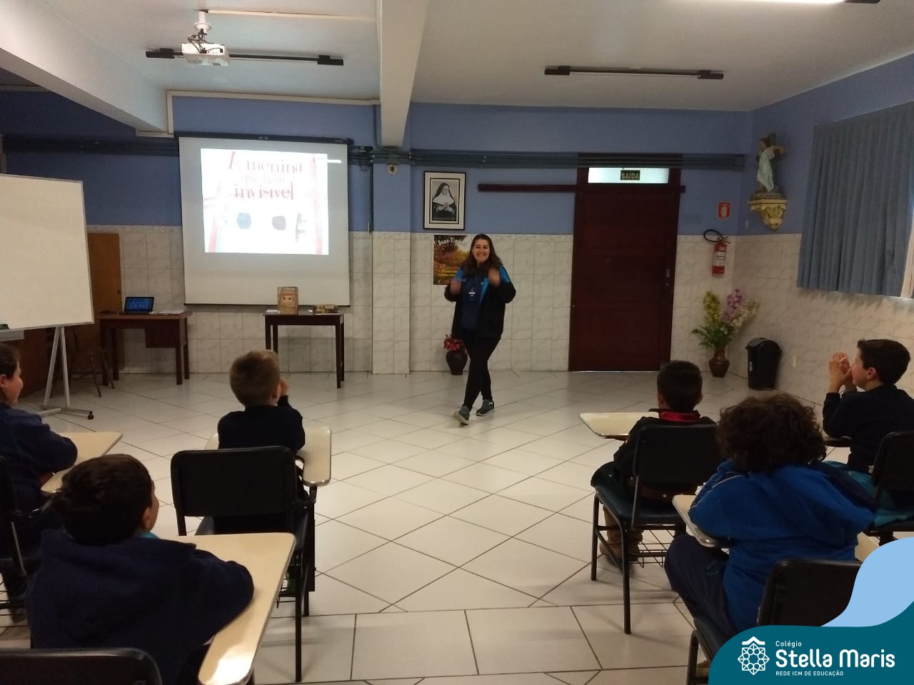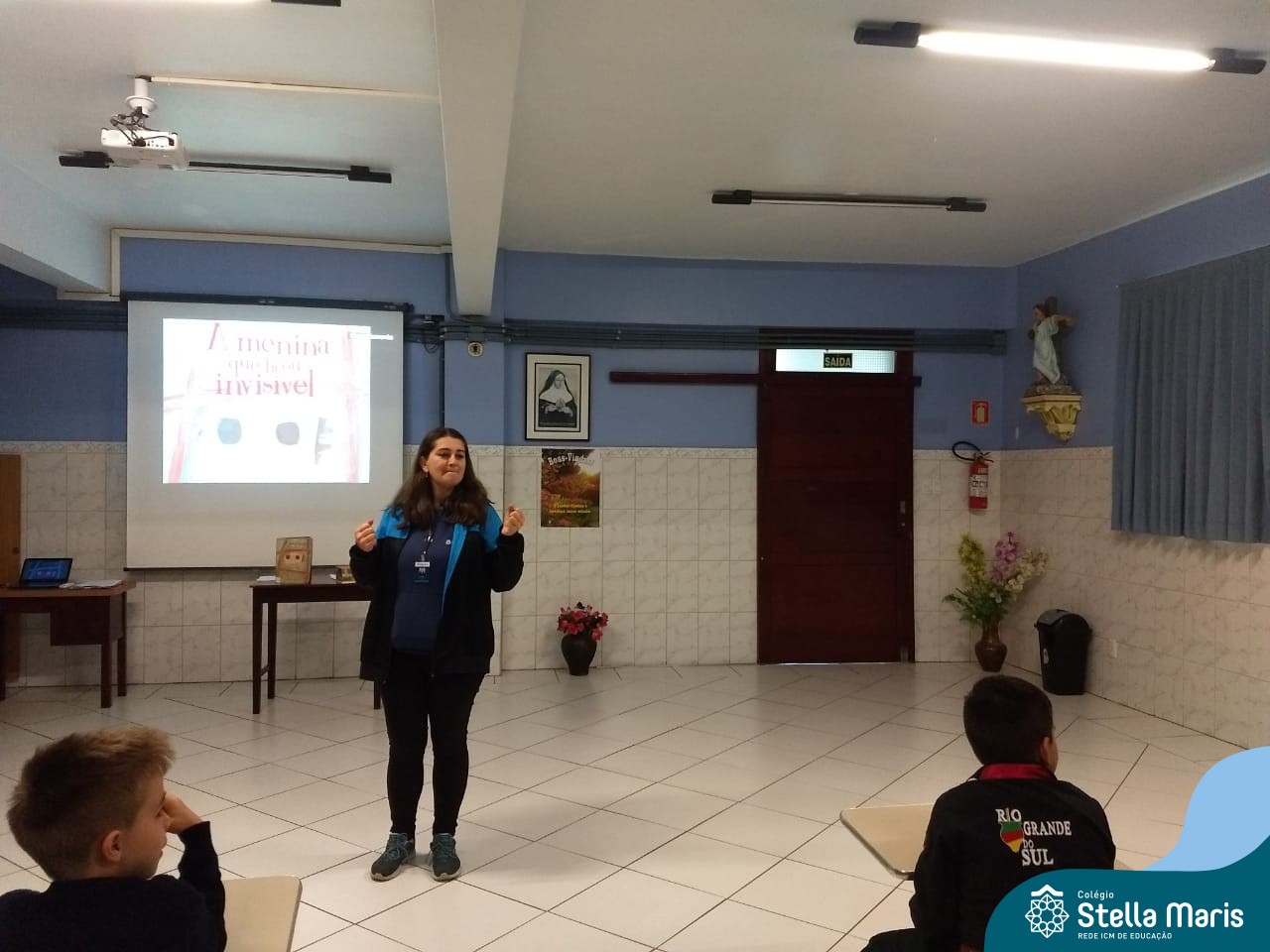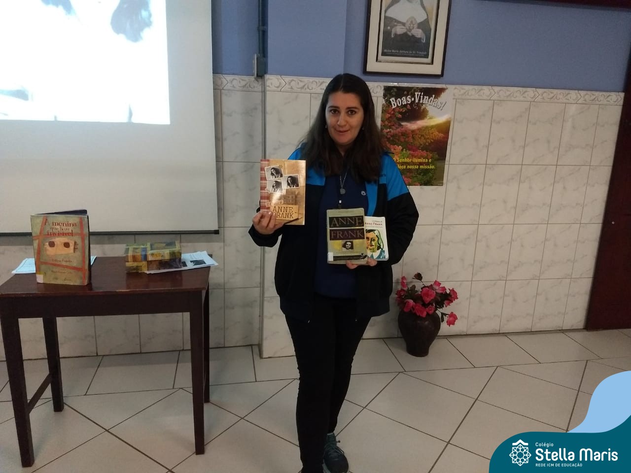 A Rita prontamente aceitou o convite, e nos presenteou com a história da Anne Frank, escrita para crianças, numa linguagem mais leve. A contação aconteceu no Salão Azul. Durante este momento, a história era projetada na lousa (digitalizada do livro “A menina que ficou invisível”, de Valéria Portella), com algumas imagens reais, abordando a questão do preconceito, da segregação, da guerra, fotos dos personagens reais, etc.