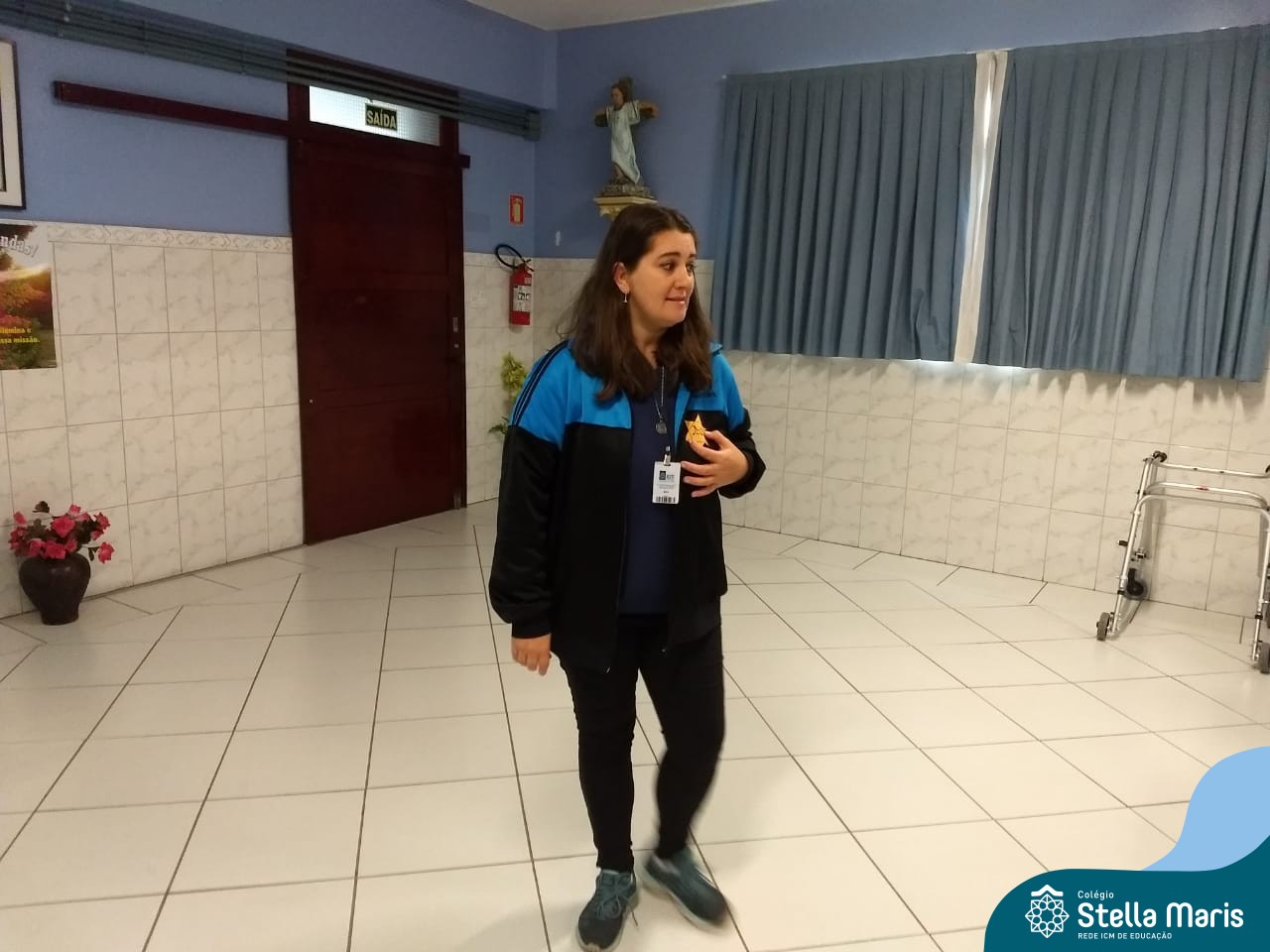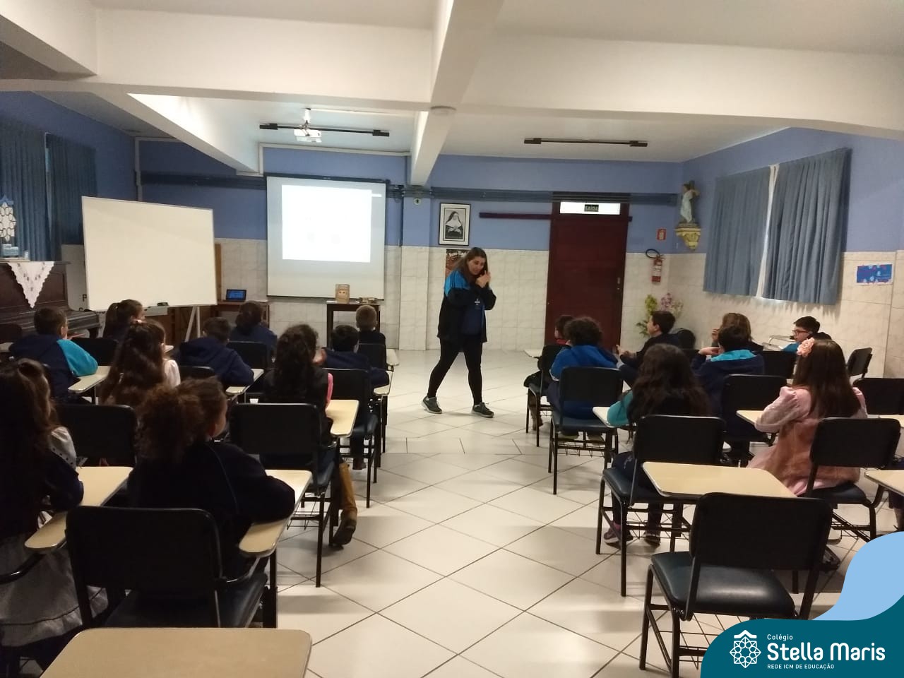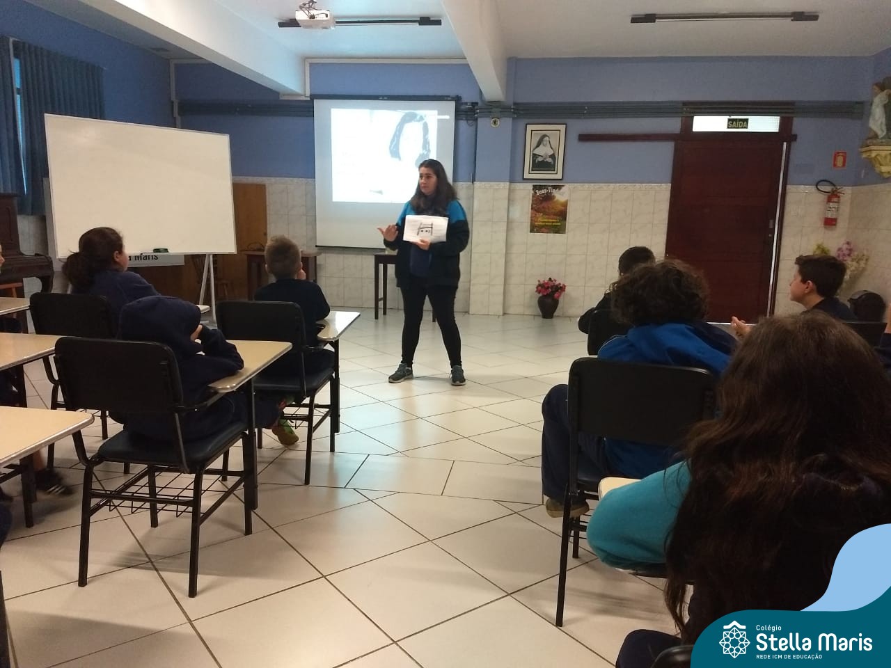 A Rita prontamente aceitou o convite, e nos presenteou com a história da Anne Frank, escrita para crianças, numa linguagem mais leve. A contação aconteceu no Salão Azul. Durante este momento, a história era projetada na lousa (digitalizada do livro “A menina que ficou invisível”, de Valéria Portella), com algumas imagens reais, abordando a questão do preconceito, da segregação, da guerra, fotos dos personagens reais, etc.