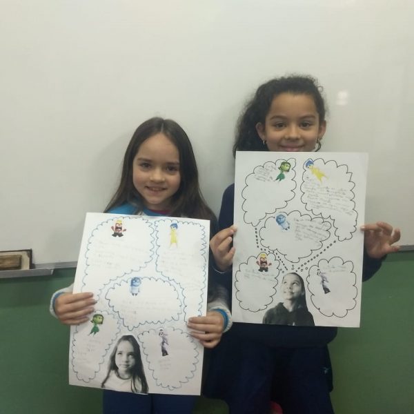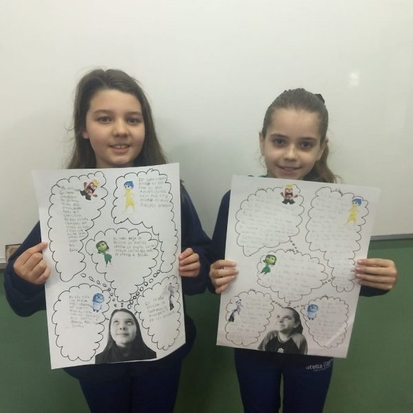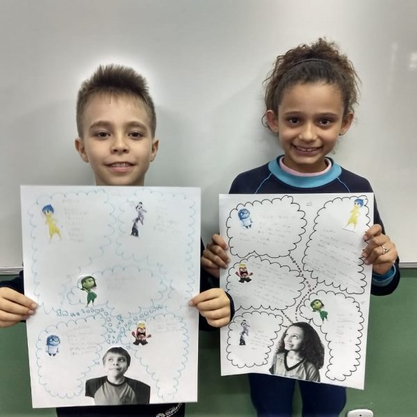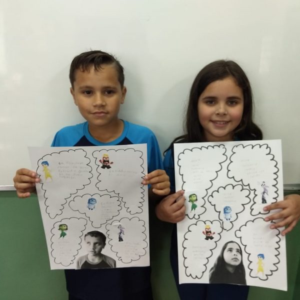 A ideia de realizar esta atividade surgiu depois de termos assistido ao filme Divertidamente, proposta no livro Pensar. Enquanto realizávamos os registros no livro, que dava enfoque às diferentes opiniões por meio de registros em caligramas, a professora Gabrielle ia ouvindo comentários e relatos de vivências riquíssimas acerca do assunto.