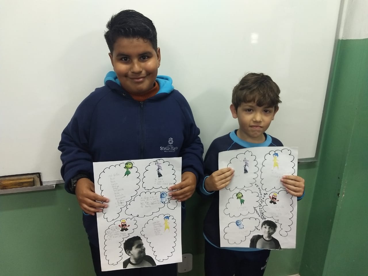 Para estimular ainda mais as crianças, foram tiradas fotografias com pose estratégica, para impressão e colagem em folha A3. A professora imprimiu os personagens que representavam os sentimentos trabalhados, para que fossem colados no trabalho de cada um.