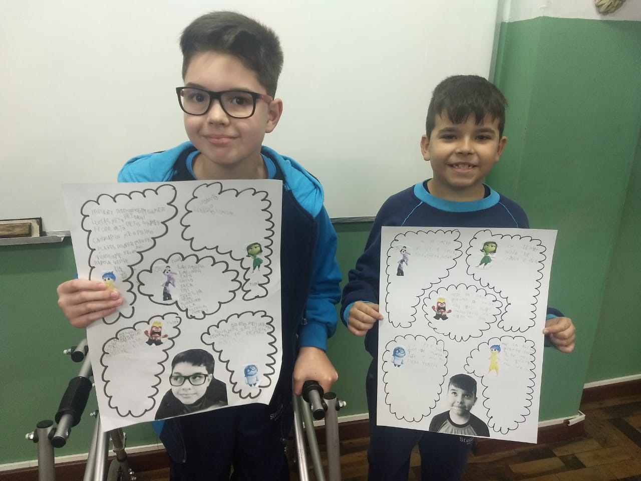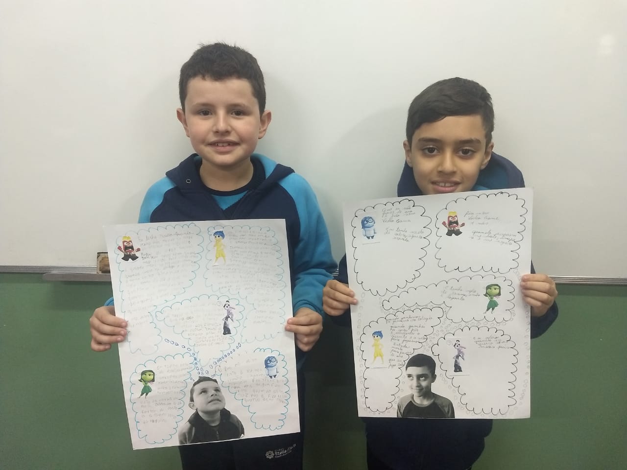 A ideia de realizar esta atividade surgiu depois de termos assistido ao filme Divertidamente, proposta no livro Pensar. Enquanto realizávamos os registros no livro, que dava enfoque às diferentes opiniões por meio de registros em caligramas, a professora Gabrielle ia ouvindo comentários e relatos de vivências riquíssimas acerca do assunto.
