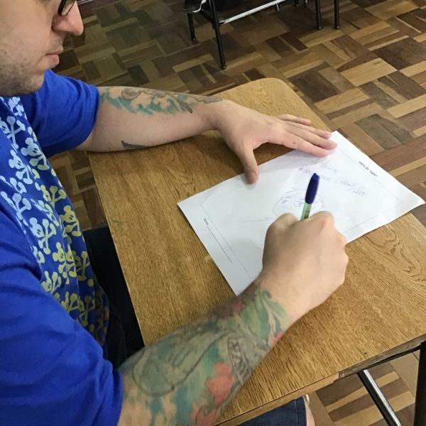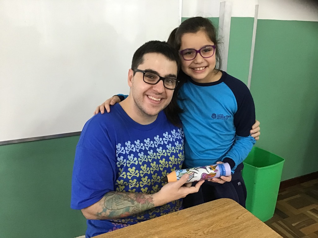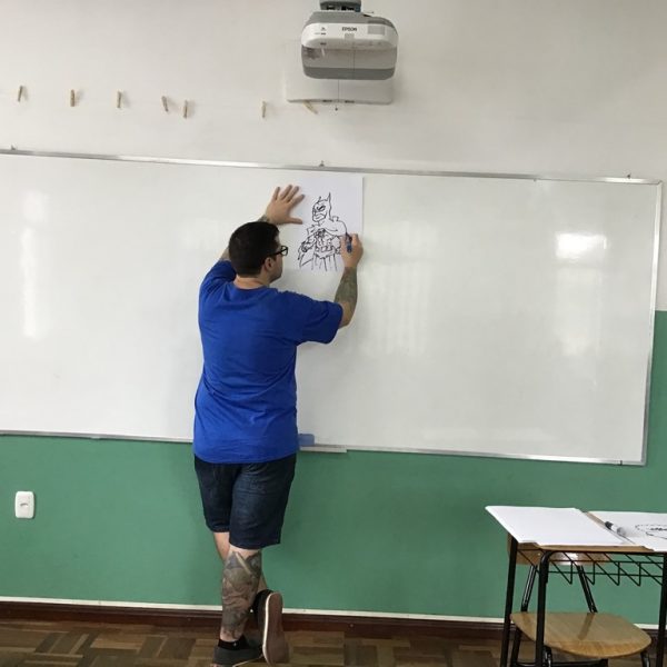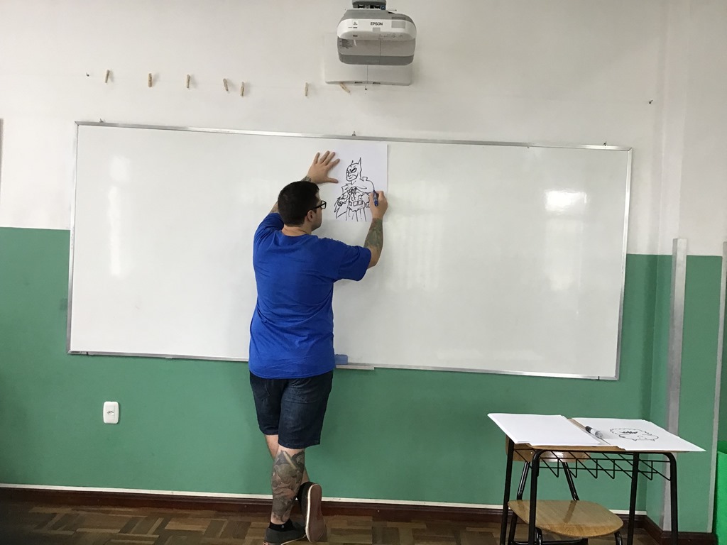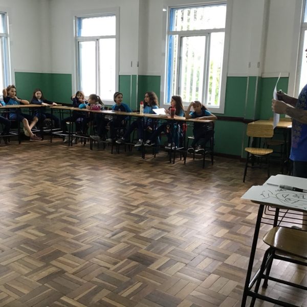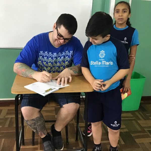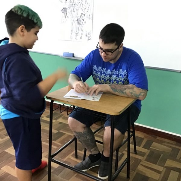 Turma 43 recebeu a visita do escritor Cadu, para realizar um trabalho e conversa com os alunos sobre o seu livro adotado, Cadu procura em Porto Alegre.